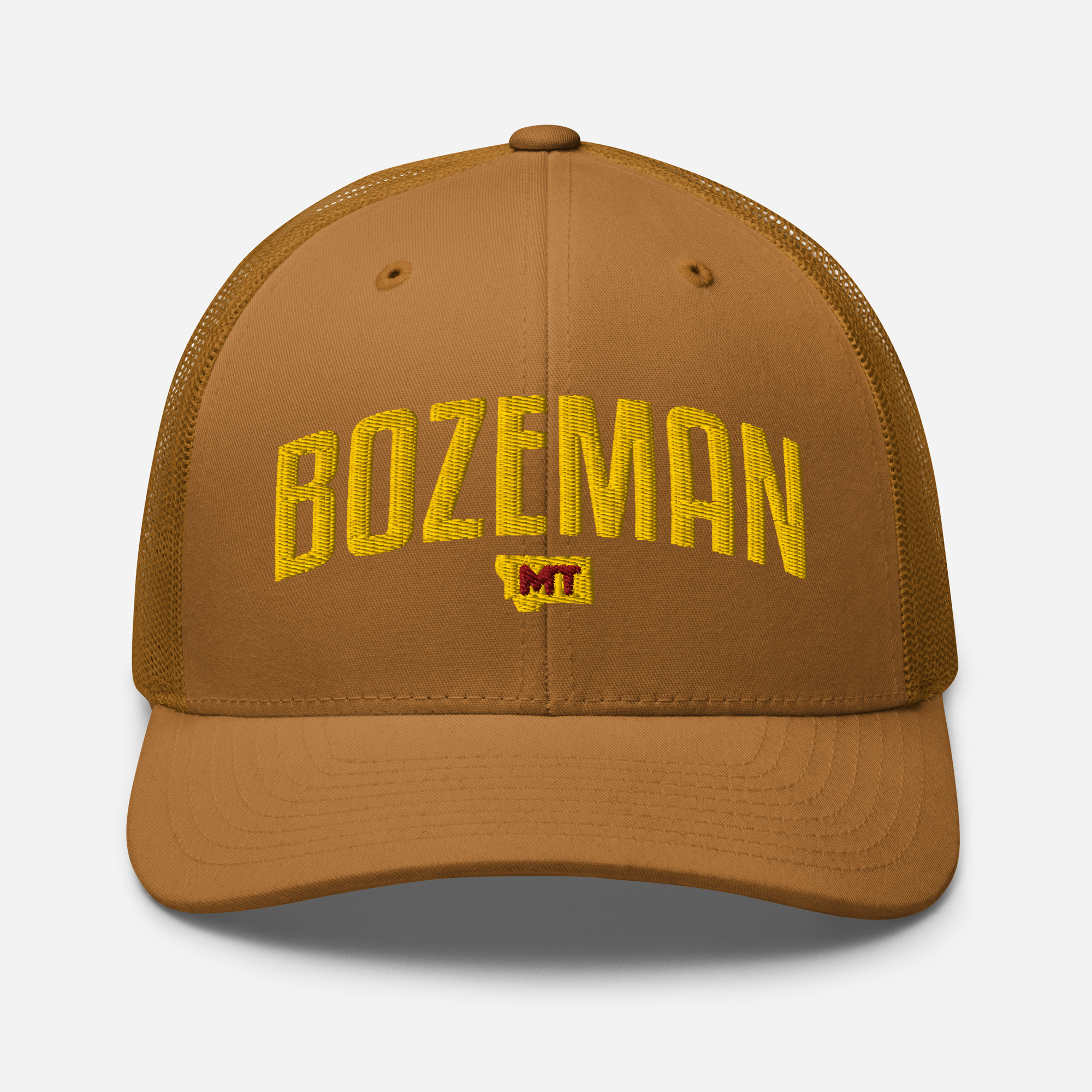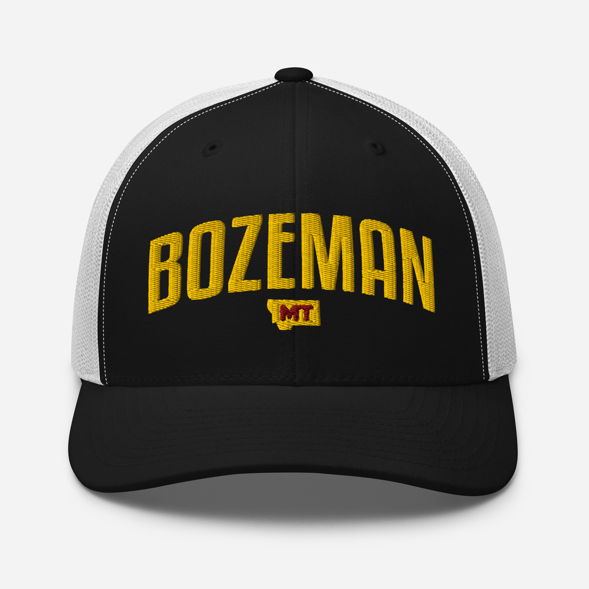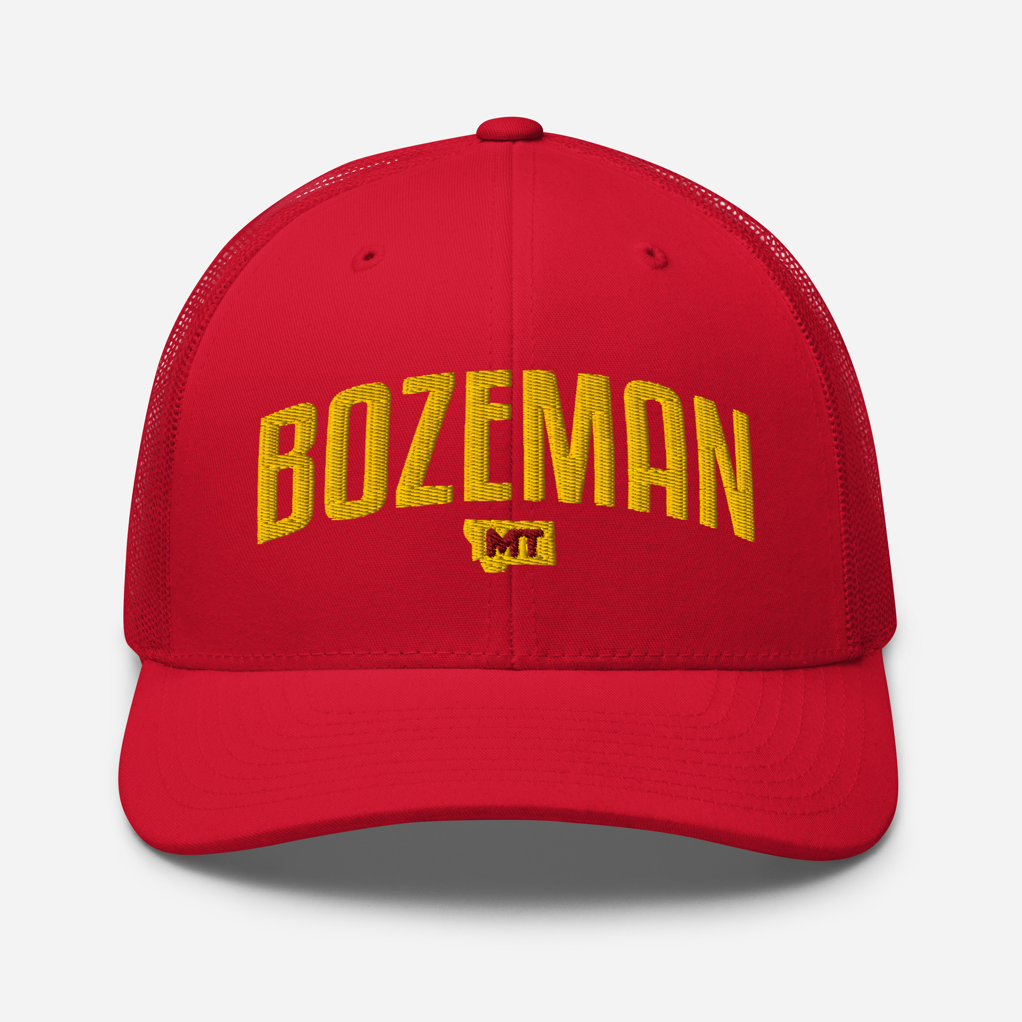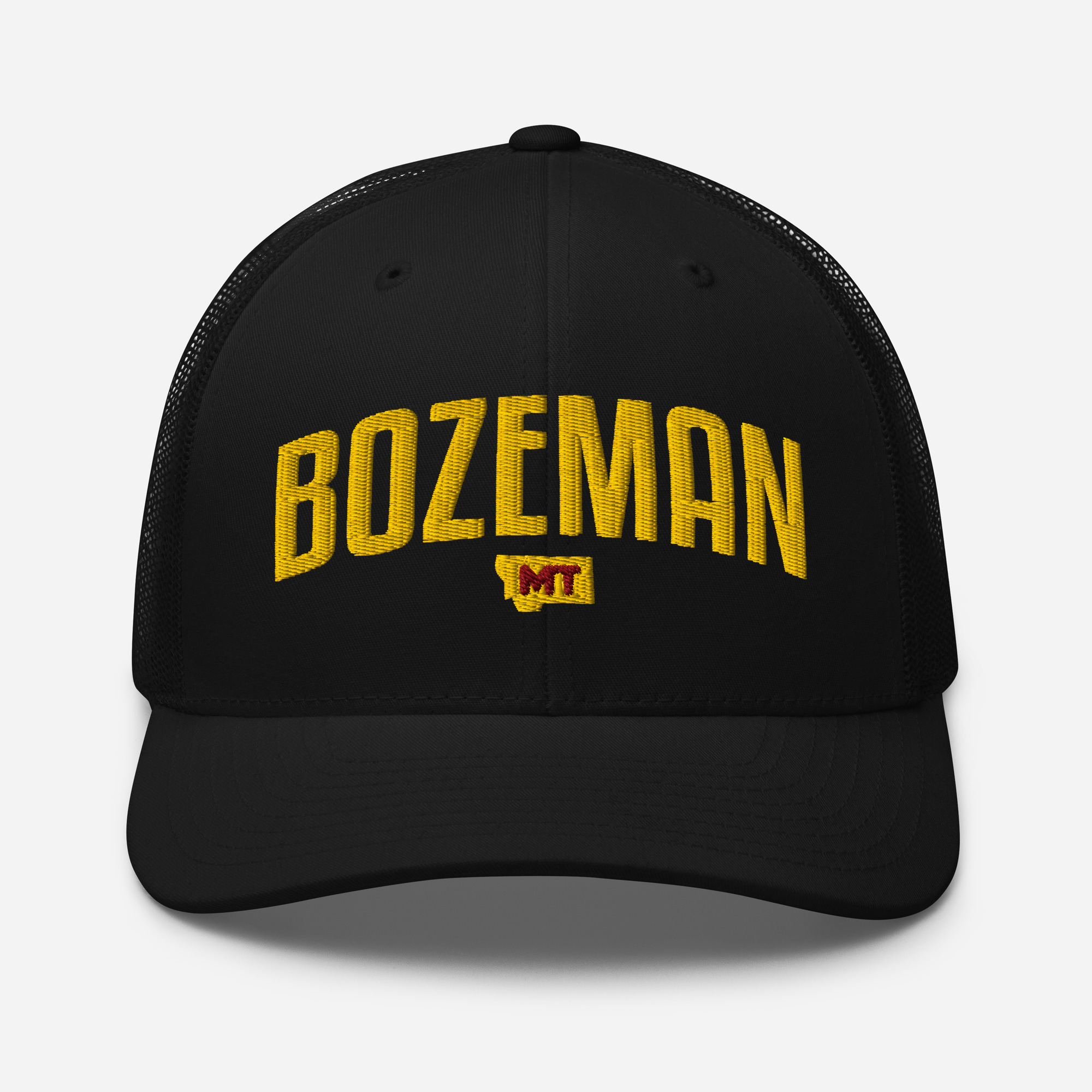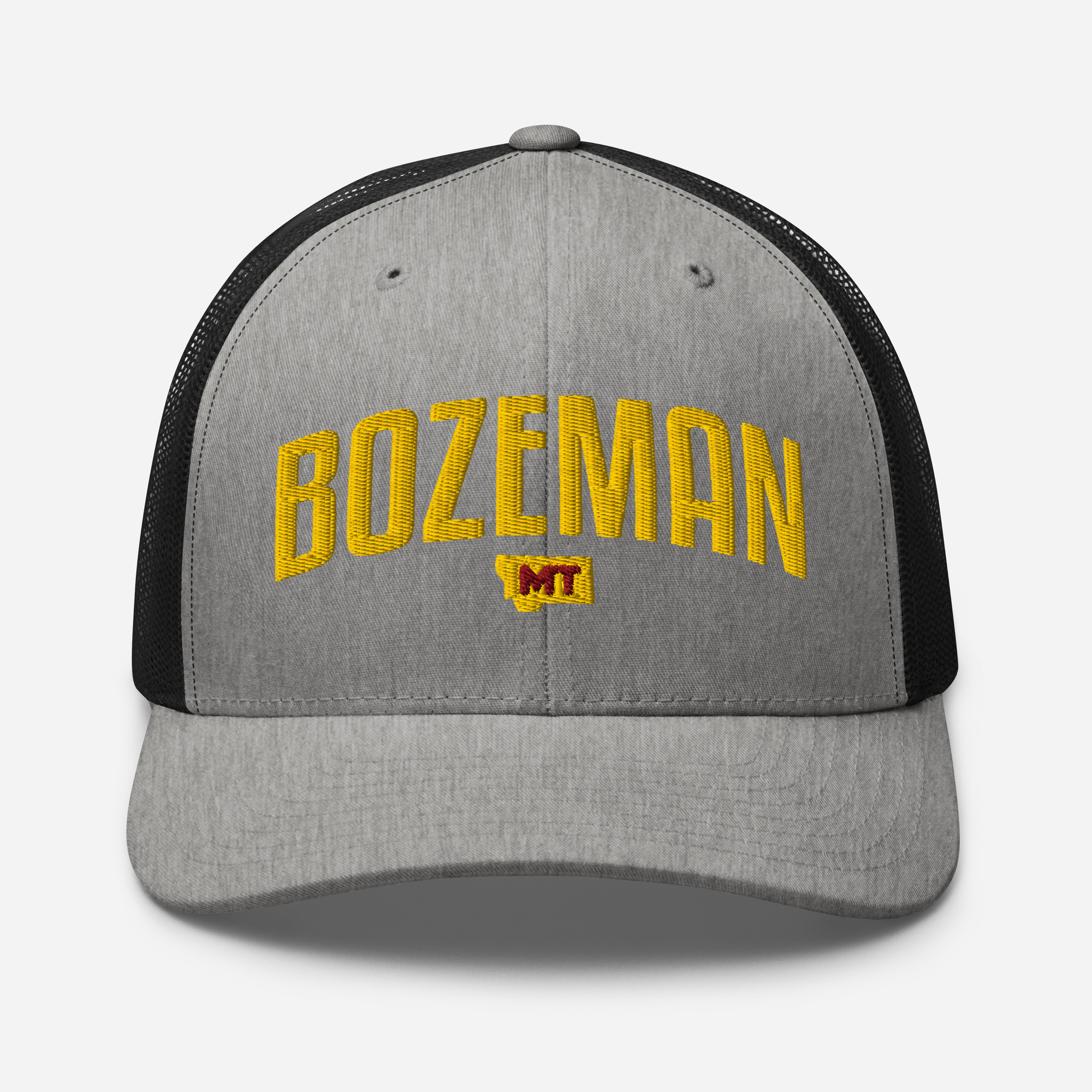 Bozeman Montana City Names Trucker Cap. This six-panel trucker cap with a mesh back will be a comfy and classic choice for a perfect day in the sun.
