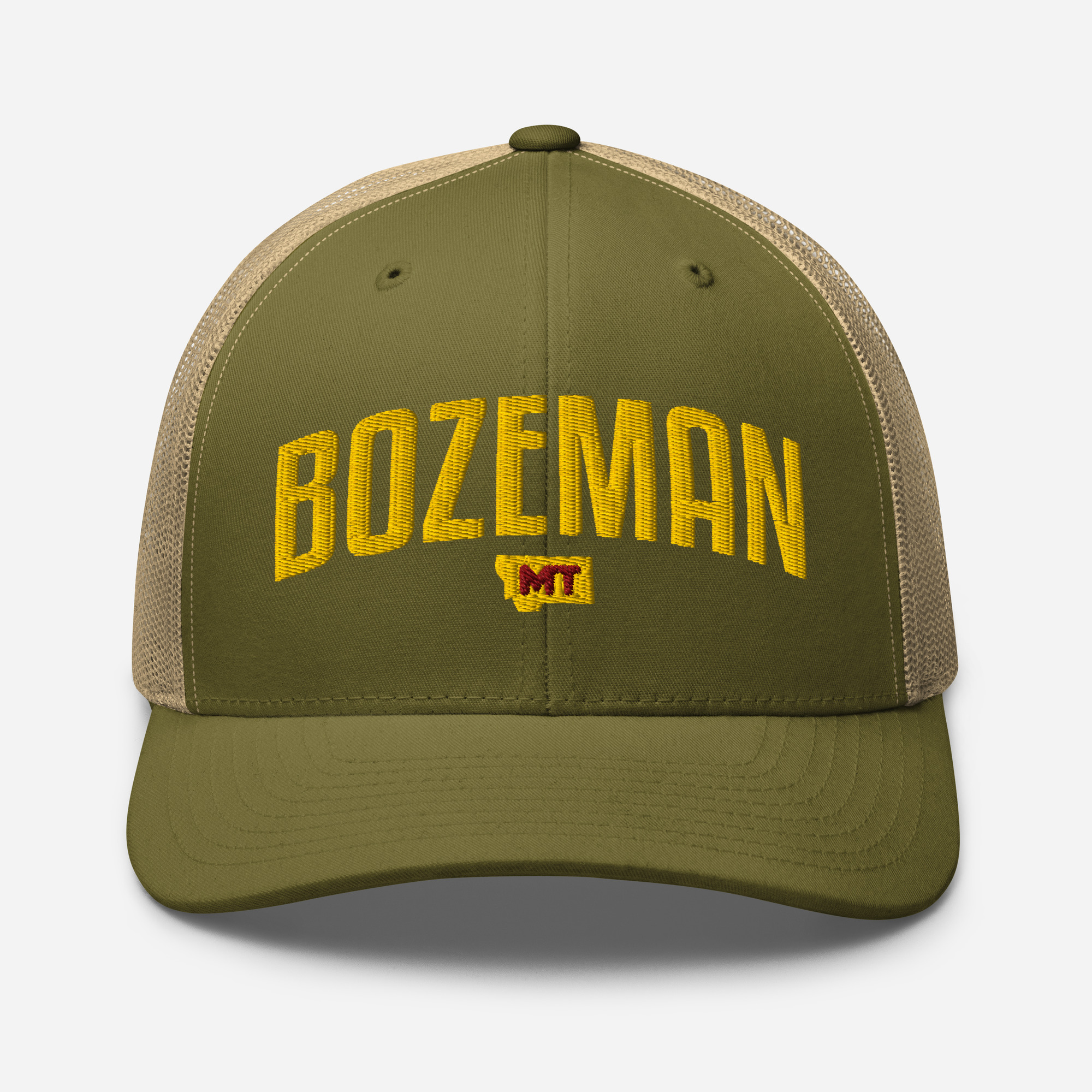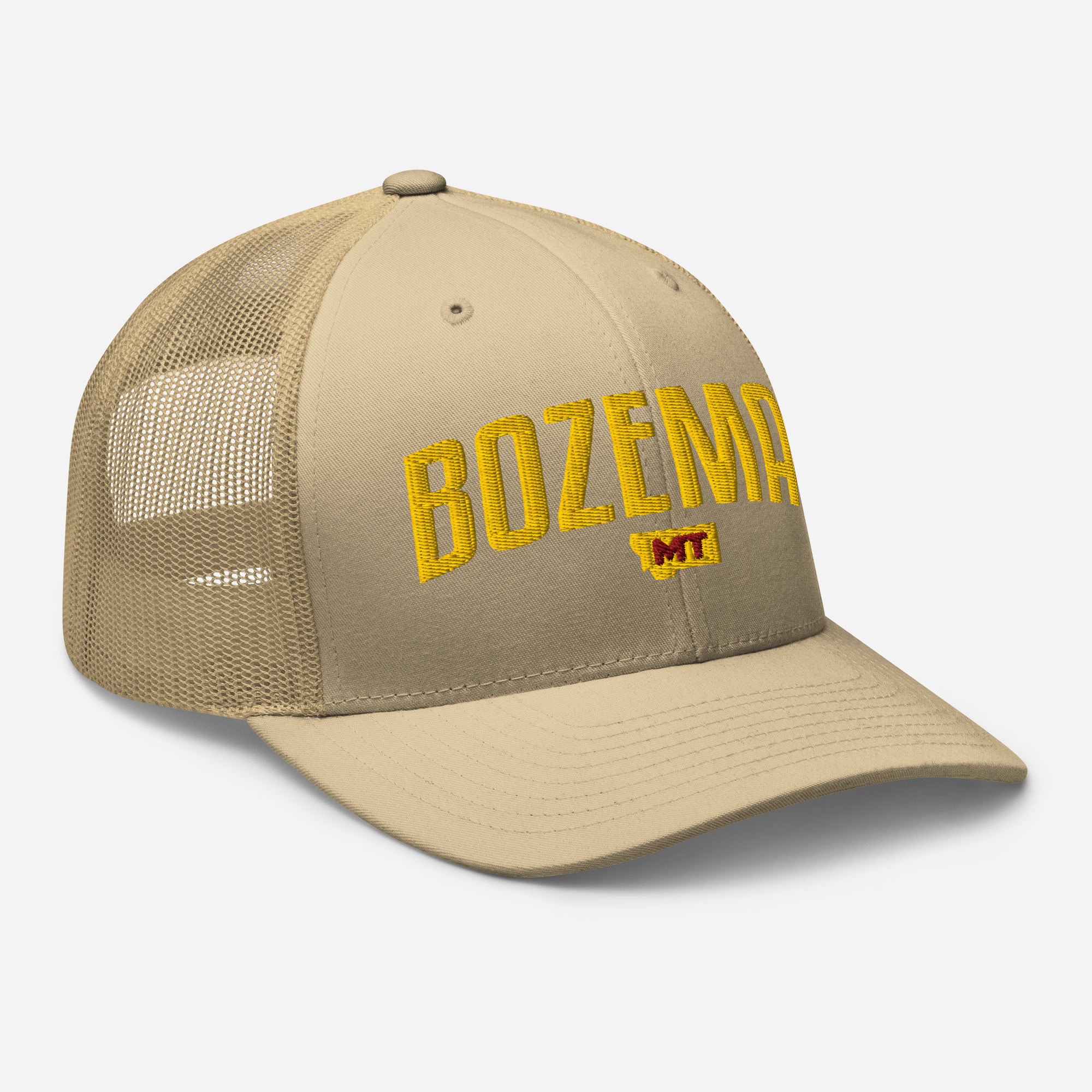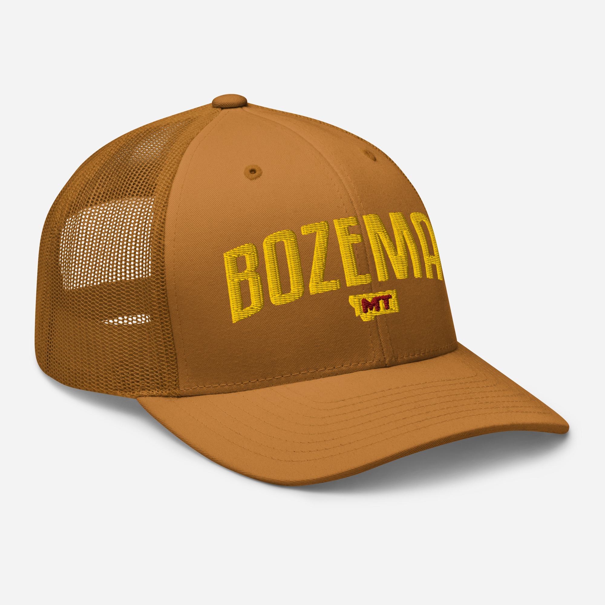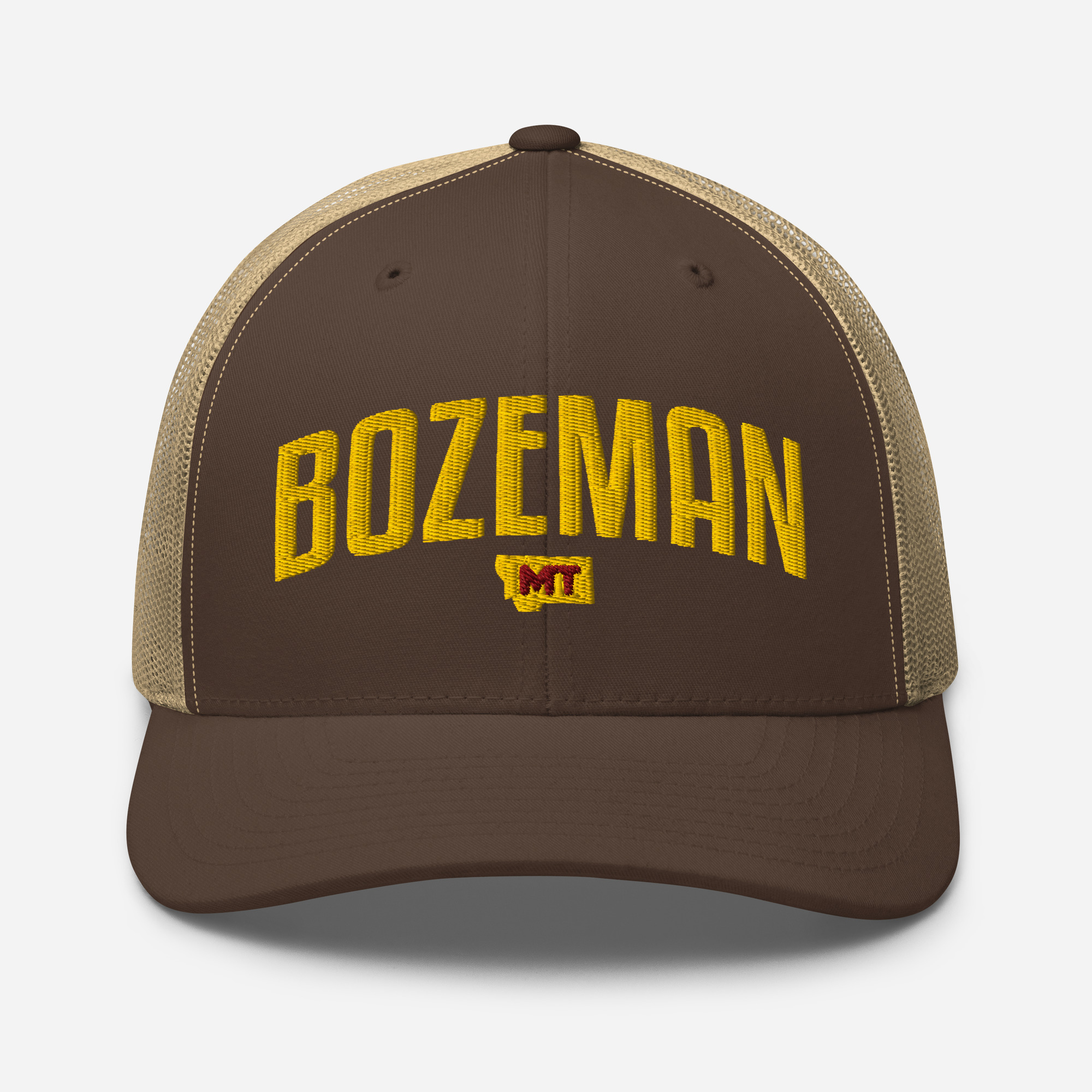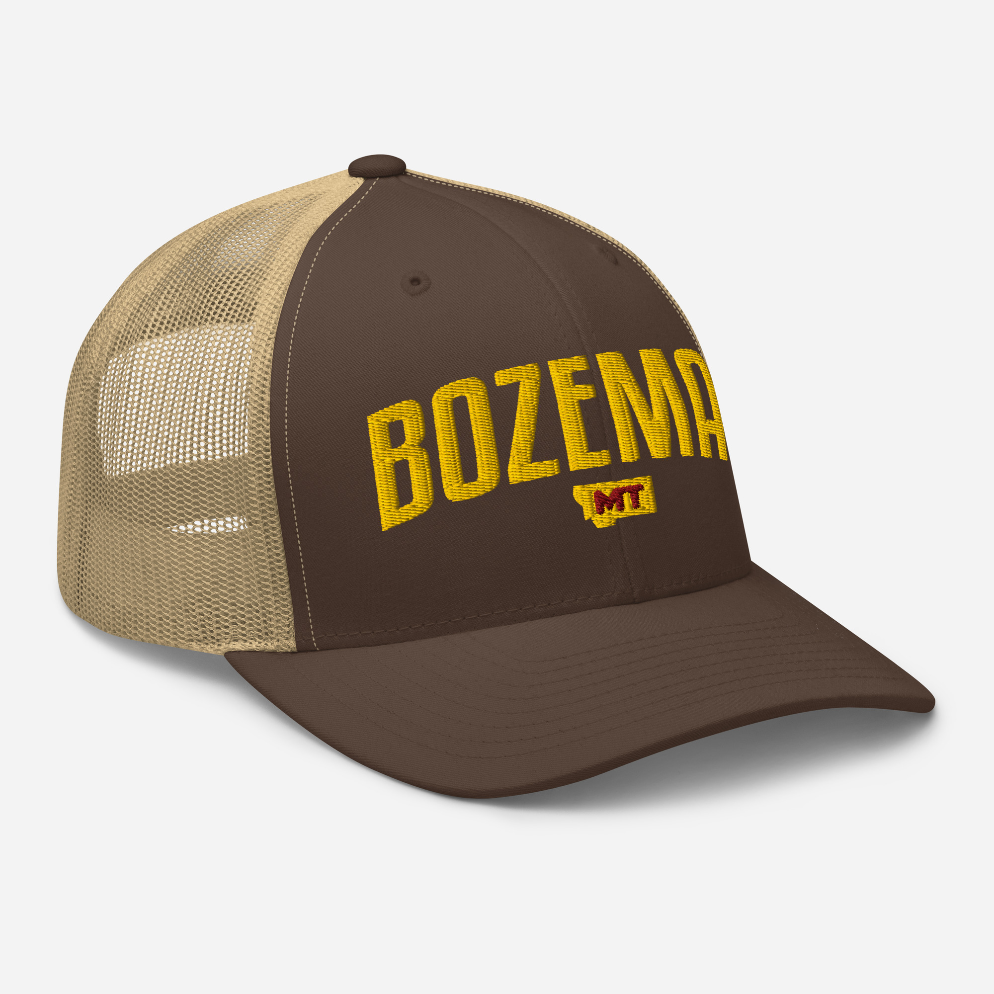 Bozeman Montana City Names Trucker Cap. This six-panel trucker cap with a mesh back will be a comfy and classic choice for a perfect day in the sun.